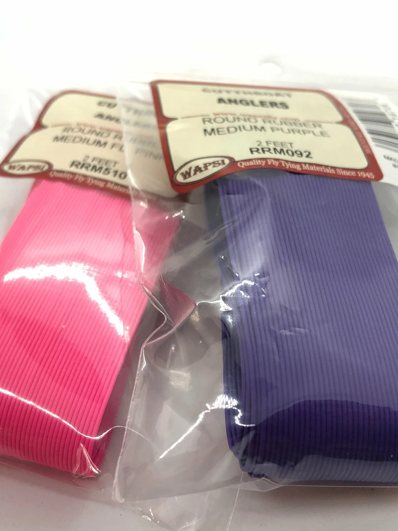 WapsiΒ Round Rubber. Β Available in variety of fish catching colors, great for rubber legs on hoppers, streamers, and nymphs. Β Can also be used for many other applications (pink, purple, tan, and red make for a great rubber worm pattern).