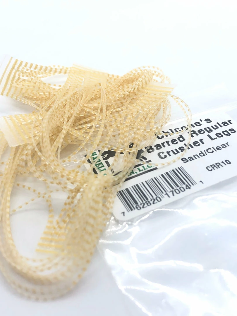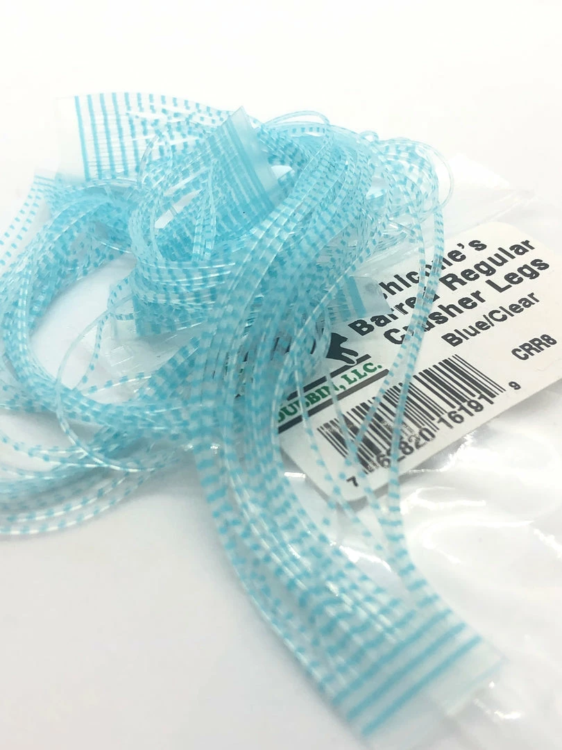 Chicone’s Barred Crusher Legs, by Hareline Dubbin. Perfect for adding life like movement and color to nymphs, hoppers, and streamers! Features beautifully barred colors over top of a translucent silicone leg.