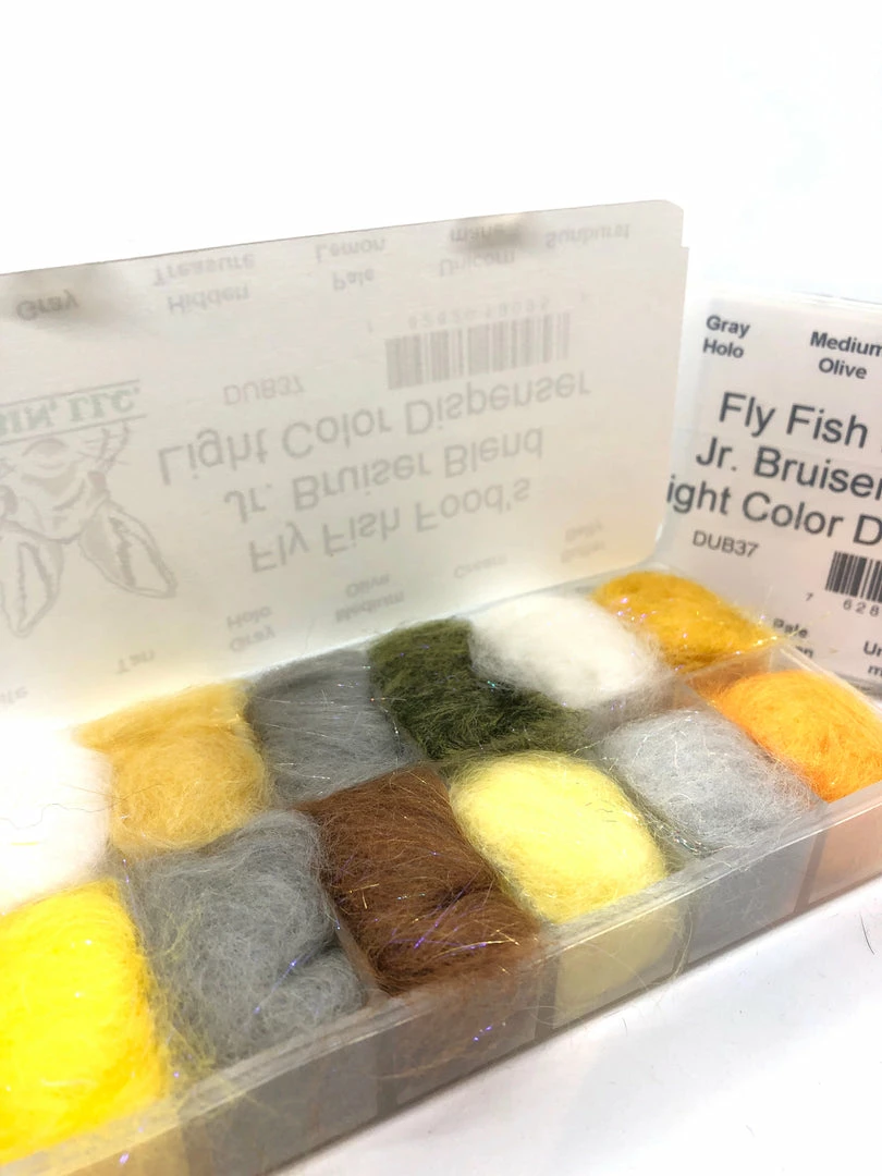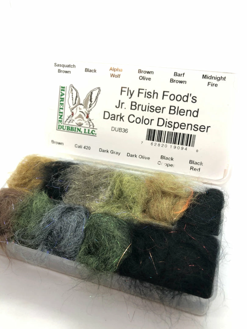 Fly Fish Food Bruiser Blend Dubbing Jr. Β Natural fibers with just the right amount of flash blended in. Β The Jr. size has fibers with a bit shorter length, which is great for tying smaller streamers and large nymphs.