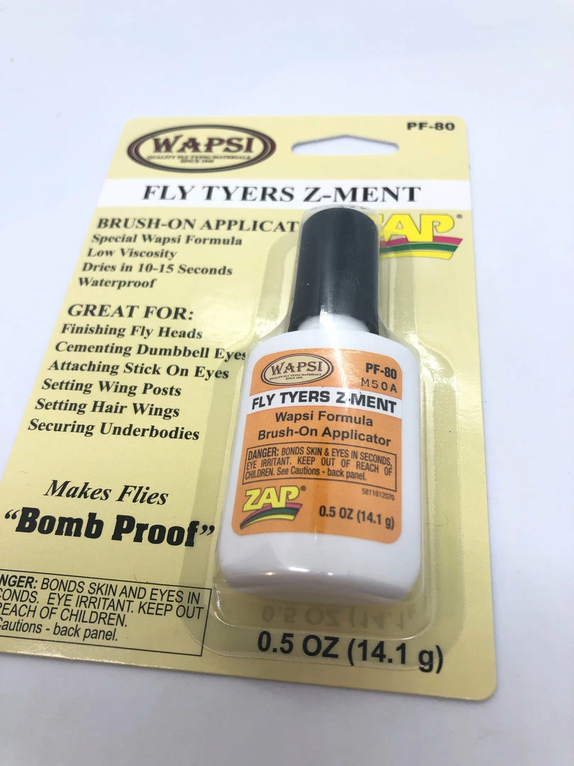 Zap-A-Gap/Wapsi Collaboration featuring a new formula that dries in 10-20 seconds. Β This stuff is great, the threaded lid with brush applicator stays neat and clean. Β Brush it right onto flies for hard coatings, or apply a small amount with a bodkin for precision. Β