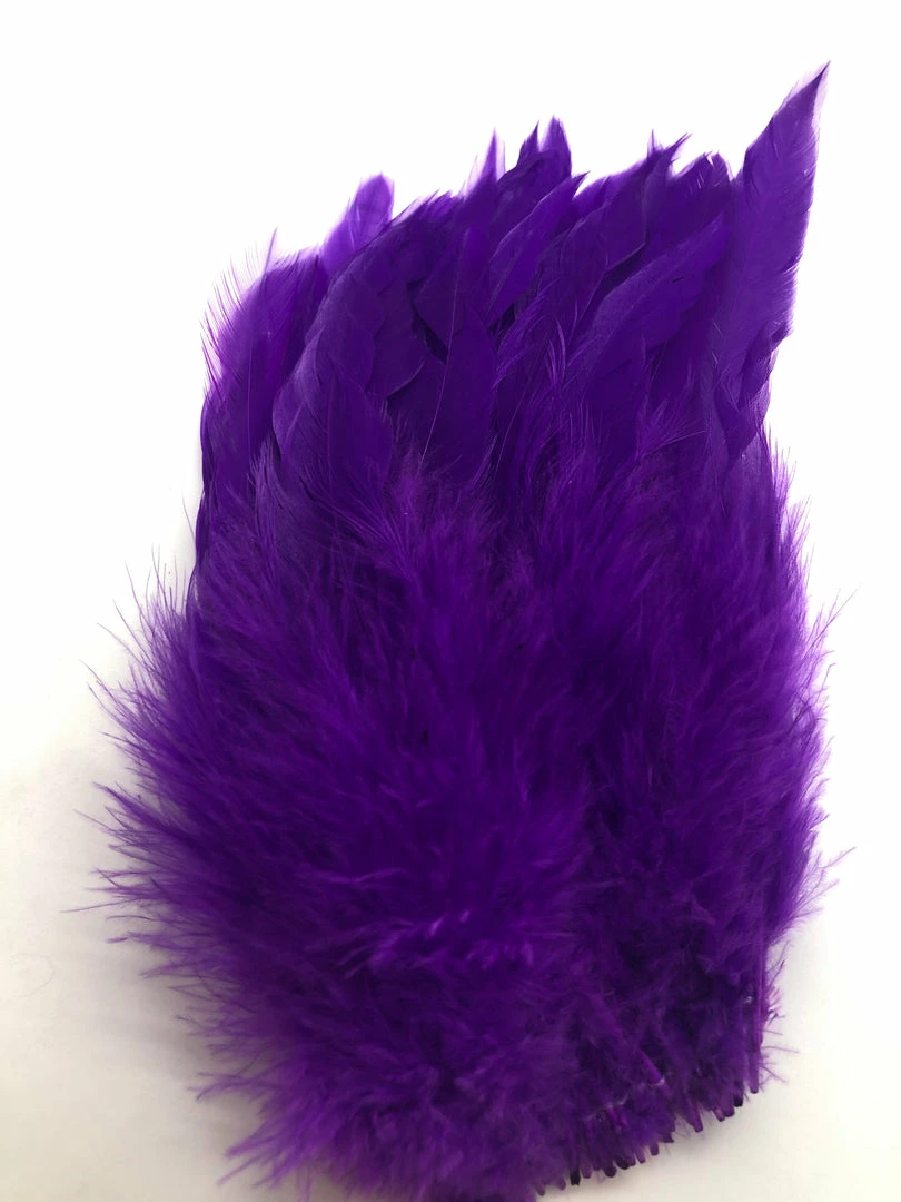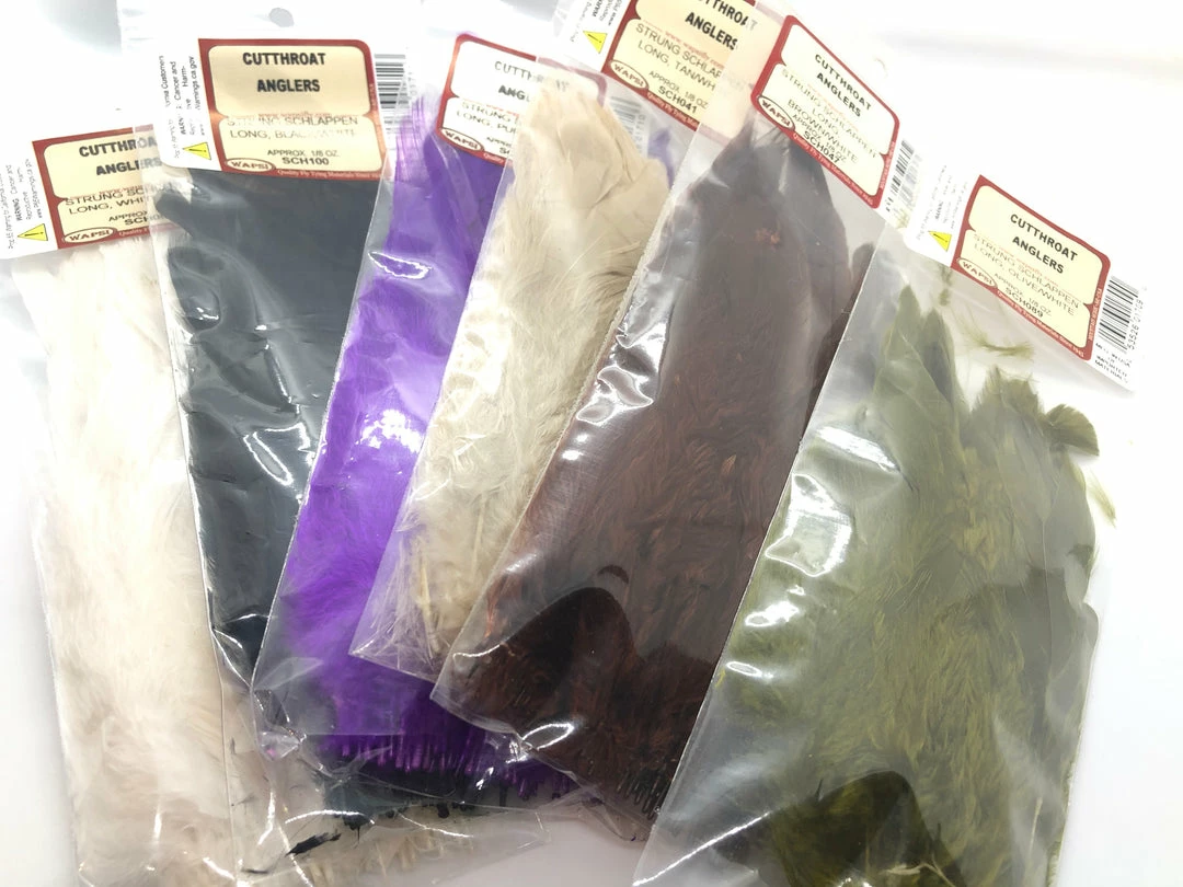 Wapsi Schlappen. Long, and loose fibered feathers are great for hackle on streamers like the “Double Gonga” and many other articulated patterns. These colors are dyed over a white feather.